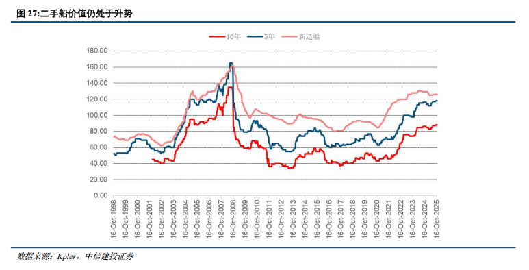 2025年OPEC改变了以往减产策略,转向增产,并进入到实质增产阶段。担忧原油供应中断,中国开始补库存。由于欧美对于影子船队的扩大制裁,目前VLCC中有约16%船队属于受限船,十年船龄VLCC增值率达到85%,船队价值的升值推高股票价值。油运走向合规牛,中远海能H仍然是首选。