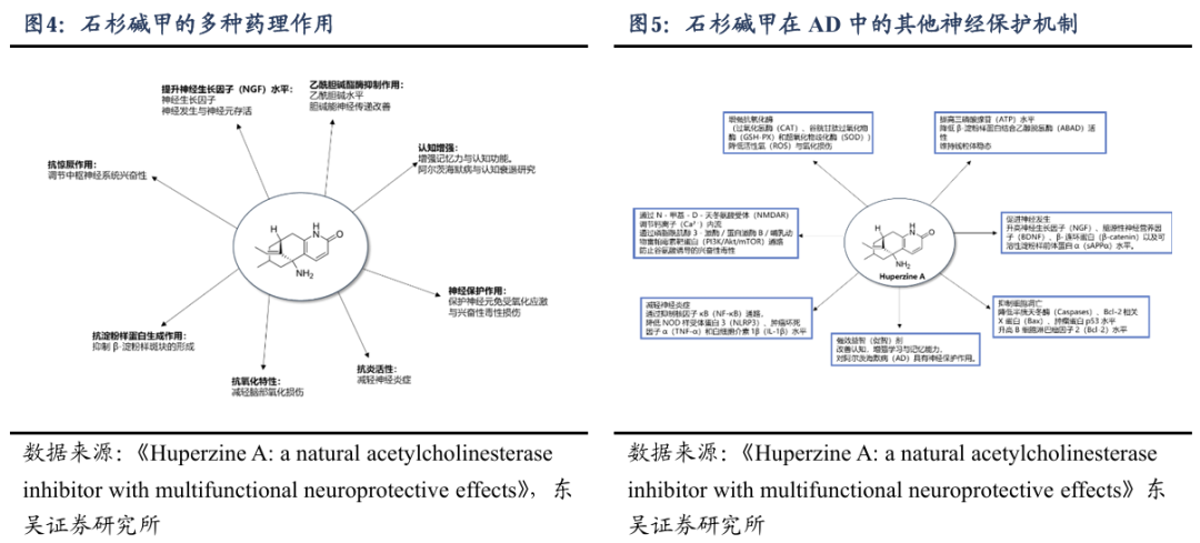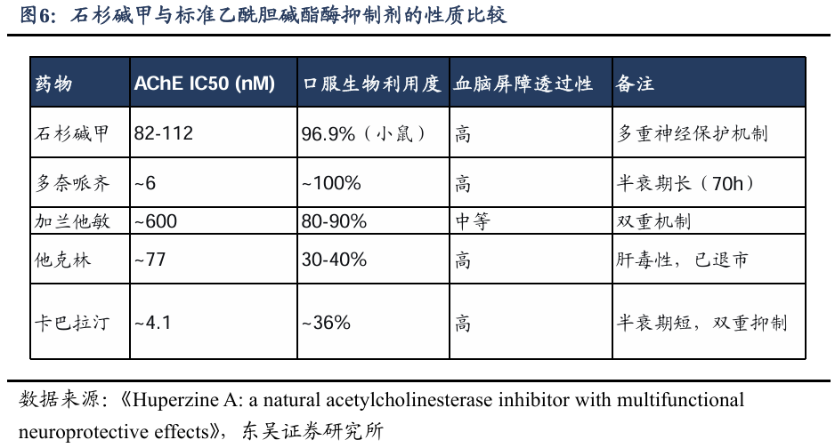 另外,和其他乙酰胆碱酯酶抑制剂相比,石杉碱甲的抑制效力介于多奈哌齐和加兰他敏之间,但其口服生物利用度高达96.9%(小鼠数据),血脑屏障透过性良好,且兼具抗氧化、抗炎、抗凋亡等多重神经保护机制。