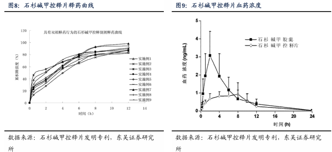 针对石杉碱甲外周血浆药物突释和半衰期短(消除相半衰期约4.1小时)的局限性,结合其中枢慢消除药代动力学及与中枢乙酰胆碱酯酶慢解离药效动力学两大特征,公司设计并研发出符合时空精细调控需求的新型速/控双相控释片,根据公司公告,石杉碱甲控释片的核心优势在于: