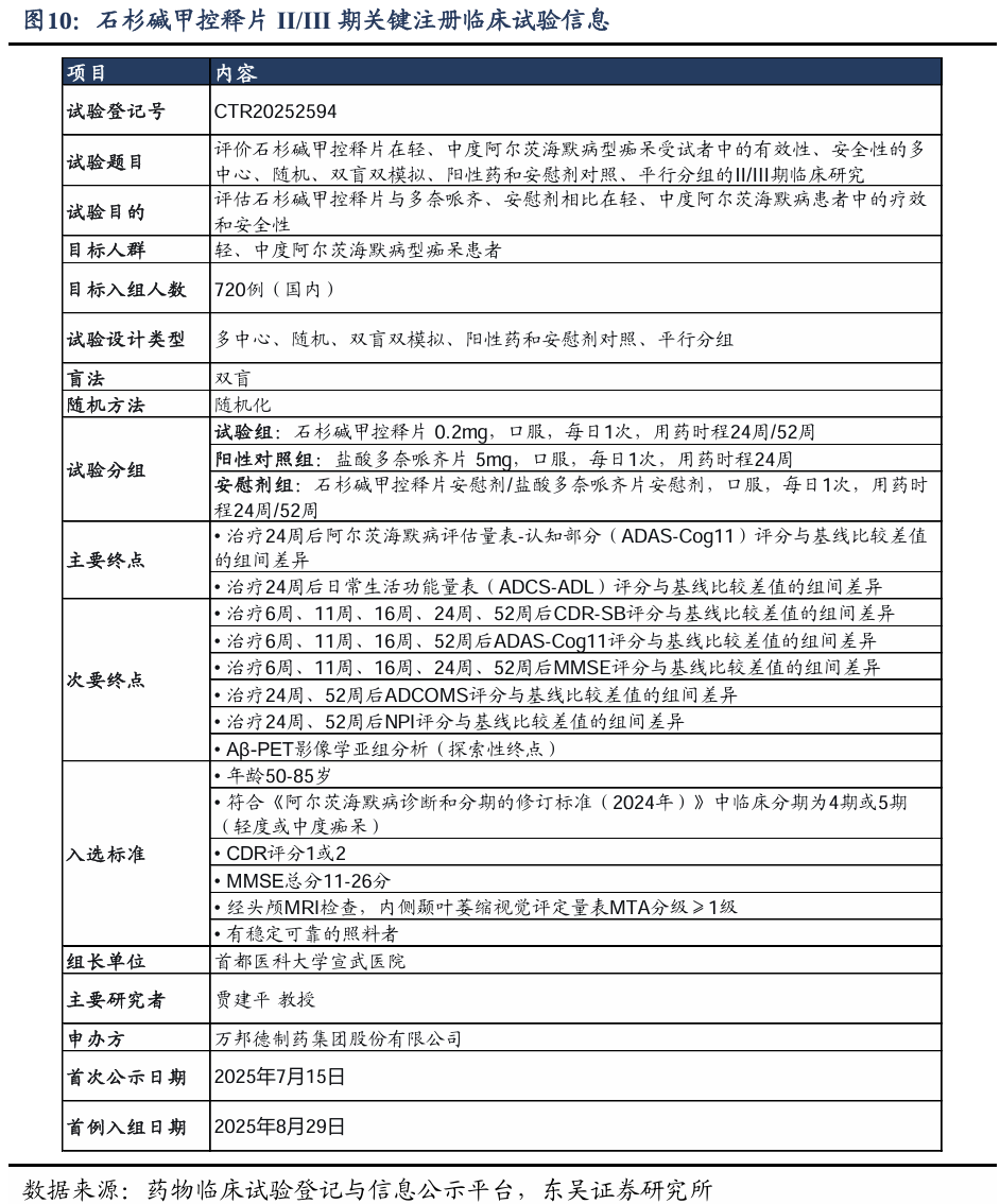 2025年7月,公司获得组长单位伦理批件后,石杉碱甲控释片II/III期关键注册临床试验正式启动。该项试验由首都医科大学宣武医院担任组长单位,由国内AD诊疗权威贾建平教授牵头,全国共有50多家研究中心参与,计划入组720例患者,评价石杉碱甲控释片在轻、中度阿尔茨海默病型痴呆受试者中的有效性、安全性的多中心、随机、双盲双模拟、阳性药(多奈哌齐)和安慰剂对照、平行分组的Ⅱ/Ⅲ期临床研究。