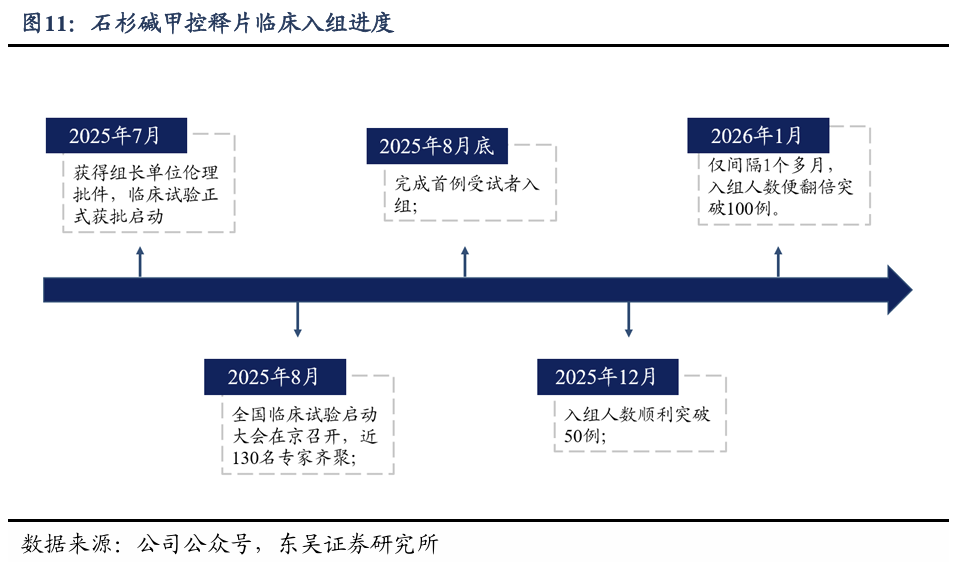2)石杉碱甲控释片临床进展快,市场潜力巨大:公司的石杉碱甲控释片,通过双相控释技术,既能满足大幅减少血药浓度“峰谷效应”,同时符合乙酰胆碱生理节律,有望实现一天单次给药、提升给药剂量与保持安全性多重目的。目前,石杉碱甲正处于关键确证III期临床,该临床入选国家科技重大专项,遵循CDE最新指南及 ICH-GCP规范,采用双主要终点(行为 认知)。截至26年2月,已入组100例患者,临床进展快。我们认为,石杉碱甲控释片有望成为AD治疗一线药物,按年化费用1万元计算,仅考虑国内市场潜在销售峰值即有望达到130亿元,海外市场空间更为广阔。