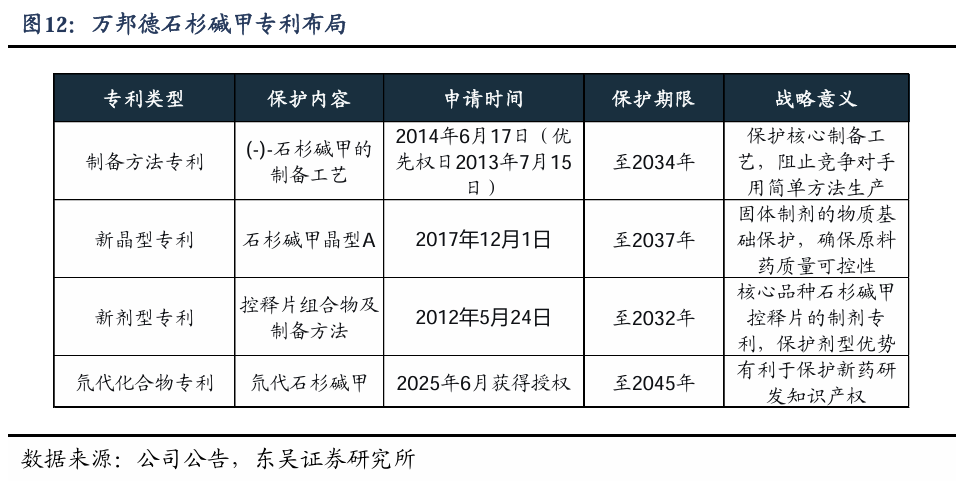 石杉碱甲作为源于天然产物的创新分子,其化合物本身已过专利保护期。但公司通过持续创新,围绕石杉碱甲构建了“化合物制备 新晶型 新剂型 氘代衍生物”的多层次专利组合,先后获得了中、美、日、欧盟共10项发明专利。既保护了当前核心品种石杉碱甲控释片的市场独占权,也为未来的产品迭代做好了技术储备。