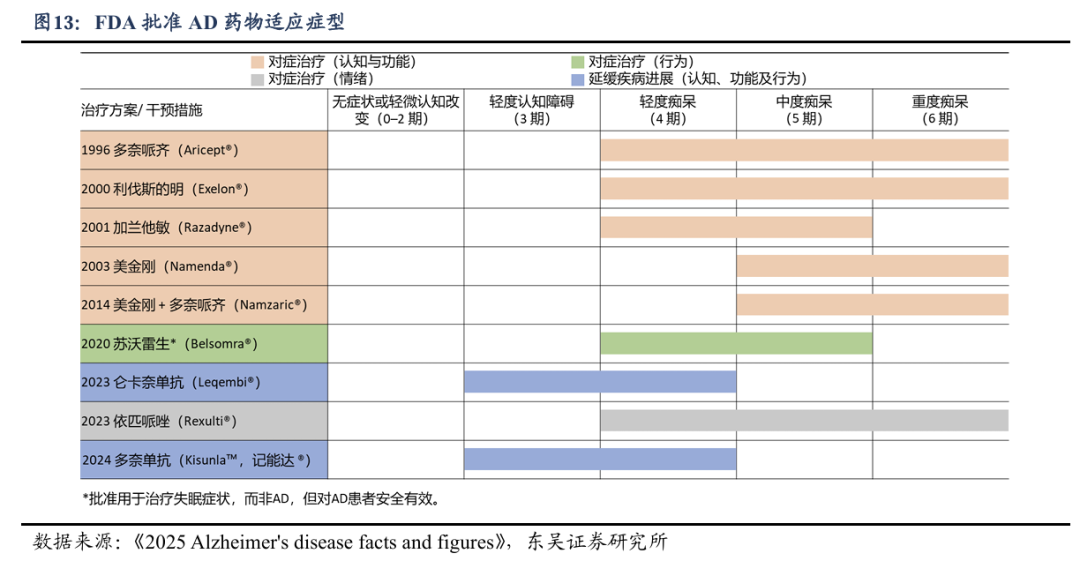 从疾病分期看,目前临床用药的分层较为明确:小分子药物(胆碱酯酶抑制剂、美金刚):主要用于4-6期AD型痴呆患者(轻中度至重度痴呆)大分子药物(抗Aβ单抗):主要用于3-4期认知障碍或轻度痴呆AD患者(AD源性MCI、轻度痴呆)