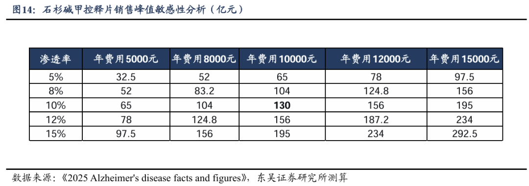 综合以上分析,在中性假设下(目标人群1300万人、渗透率10%、年治疗费用10000元),石杉碱甲控释片的国内销售峰值约为130亿元。敏感性分析显示,在渗透率5%-15%、年费用5000-15000元区间内,销售峰值介于32.5-292.5亿元之间。