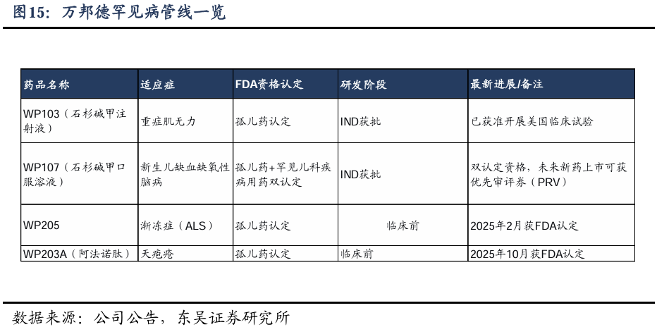 公司的WP203A于2025年10月获得FDA孤儿药资格认定。作为已上市药品的适应症拓展,可依托FDA相关路径,桥接药品部分已有的药理毒理、临床药理等数据,快速完成临床研究,支持上市申请。目前,公司的 WP203A 长效制剂正在开发中。