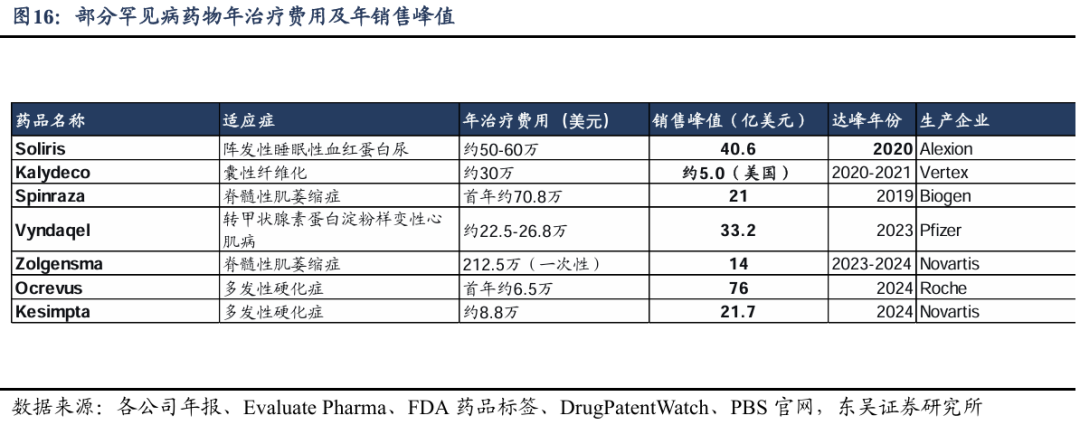由于患者基数小,孤儿药通常采用高定价策略以实现商业回报。我们整理了部分全球市场孤儿药年治疗费用及年销售峰值,发现:1)孤儿药年治疗费用普遍在20万-50万美元区间,基因疗法可达200万美元以上一次性治疗;2)即使是罕见病,单药年销售额也可达数十亿美元级别。