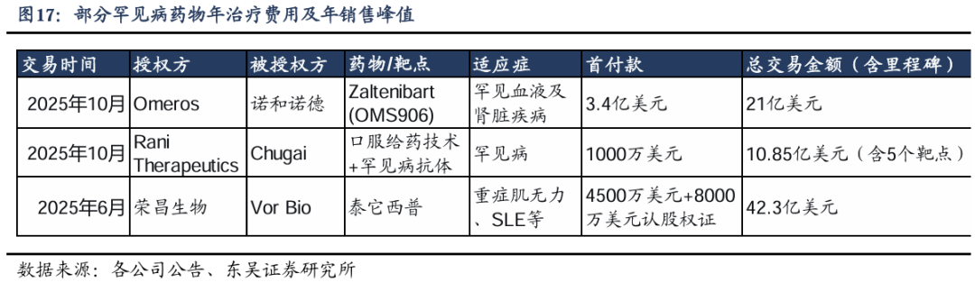 此外,近年来,孤儿药大额BD案例频出,即使是临床早期品种,首付款也可达数千万至数亿美元(如诺和诺德收购OMS906首付3.4亿美元),里程碑付款可放大至数十亿美元。