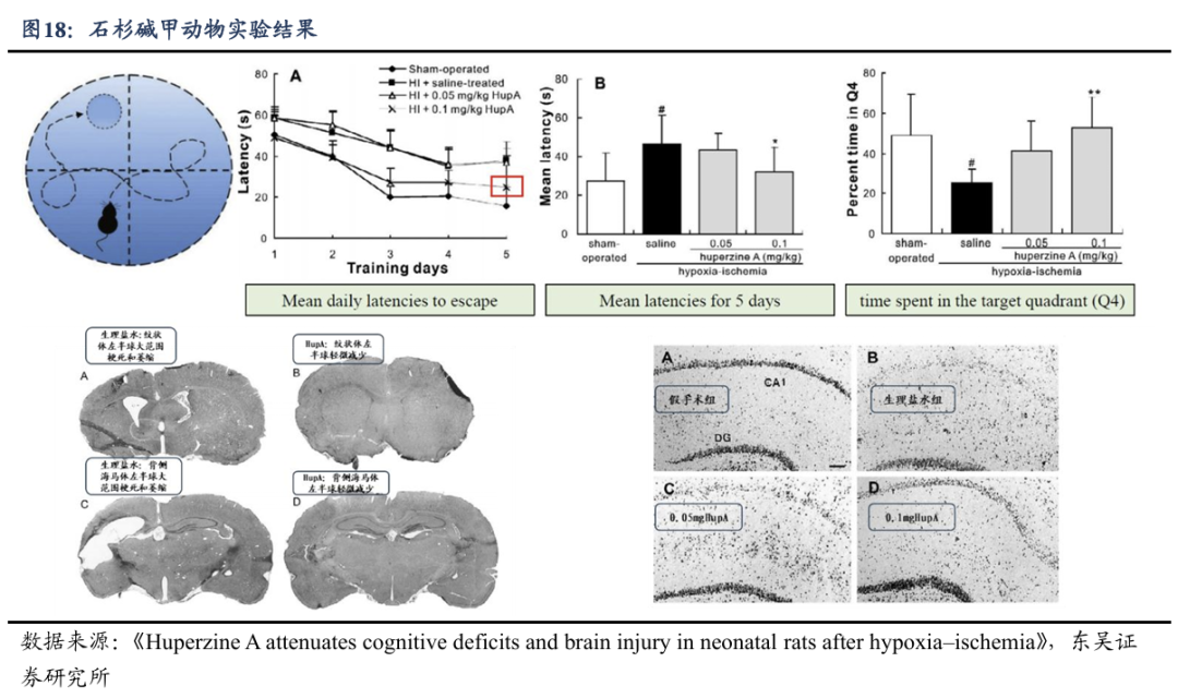 认知功能改善:在Morris水迷宫实验中,HIE模型组大鼠逃避潜伏期显著延长,表明空间学习记忆能力受损。0.1mg/kg石杉碱甲治疗组逃避潜伏期较模型组显著缩短(P<0.01),目标象限停留时间显著增加(P<0.01),提示石杉碱甲可有效逆转HIE导致的认知缺陷。