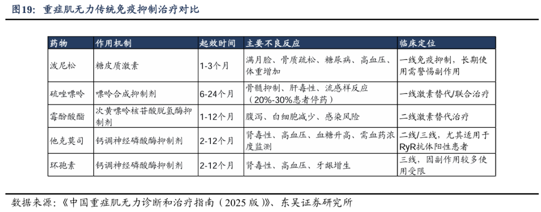 目前,溴吡斯的明(吡啶斯的明)是MG的一线对症用药,通过抑制乙酰胆碱酯酶改善肌无力症状。但溴吡斯的明仅能改善症状,无法改变疾病进程,约1/3患者即使接受治疗仍会出现急性加重。除溴吡斯的明外,临床上常用的免疫抑制治疗药物还有泼尼松、硫唑嘌呤等。此外,近年来,针对不同靶点的生物制剂改变了MG的治疗格局,但生物制剂同样面临价格昂贵、输注反应等问题。