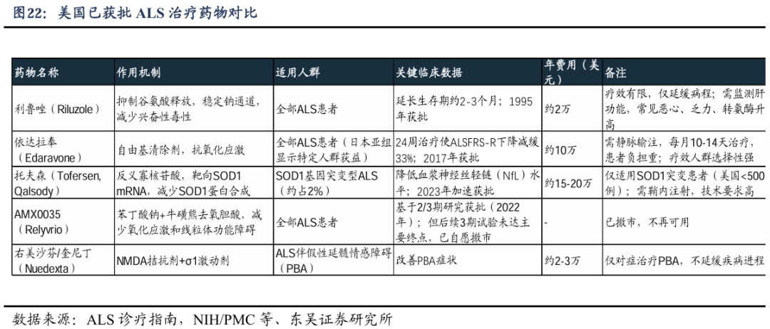 尽管FDA已批准几款药物用于治疗ALS,但现有治疗手段仅能延缓病程,如利鲁唑仅能延长生存期2-3月,托夫森仅适用SOD1突变患者(美国<500例); ALS存在巨大未满足医疗需求。