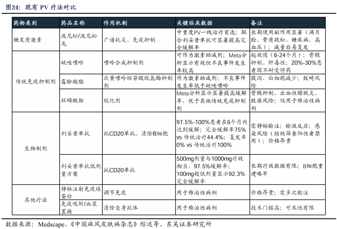 目前临床上针对天疱疮的疗法,主要包括糖皮质激素、传统免疫抑制剂、生物制剂三大类。大剂量糖皮质激素是一线治疗,但长期使用副作用显著(满月脸、骨质疏松、糖尿病、高血压等),且减量后易复发。生物制剂则面临需要注射、价格昂贵等问题。