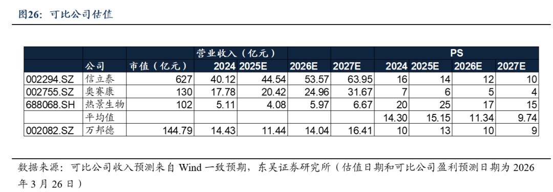 综上所述,罕见病管线因为尚未进入三期临床,按照现有对应市值折价50%,按照2026年3月25日汇率(6.8729人民币=1美元)计算,公司管线估值约570亿元。考虑到公司创新药管线持续兑现,给与“买入”评级。考虑到公司已转型创新药企业,我们选取在创新药企业布局较深的信立泰、奥赛康、热景生物作为可比公司,2025-2027年行业平均PS为15.15/11.34/9.74X,高于公司PS倍数。