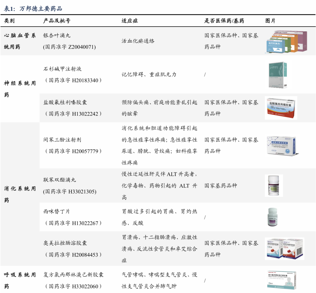 万邦德制药集团前身温岭制药厂成立于1970年,2002年被公司收购并改制,随后相继推出银杏叶滴丸、石杉碱甲注射液等产品。医药制造板块产品涉及心脑血管、神经系统、呼吸系统、消化系统疾病和精神系统等多个治疗领域,剂型涵盖滴丸剂、片剂、颗粒剂、大容量注射剂和小容量注射剂等 14 个剂型,是国内拥有药品剂型较多的制药企业之一,拥有177个产品、201 个药品批准文号,形成以天然植物药为特色,以心脑血管和神经系统用药为主,呼吸系统、精神系统、消化系统等领域用药齐头发展的产品格局。