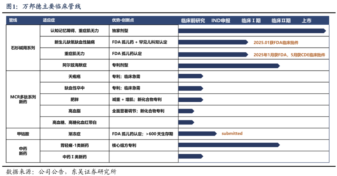 自2022年全面向国际化创新药企转型以来,公司已在罕见病领域取得一系列实质性进展。截至26年2月,围绕石杉碱甲、甲钴胺、多肽新药三大技术平台,公司累计获得5项FDA孤儿药认定(含1项罕见儿科疾病用药认定),覆盖重症肌无力、新生儿缺血缺氧性脑病、渐冻症、天疱疮等多个神经系统及自身免疫性罕见病领域。