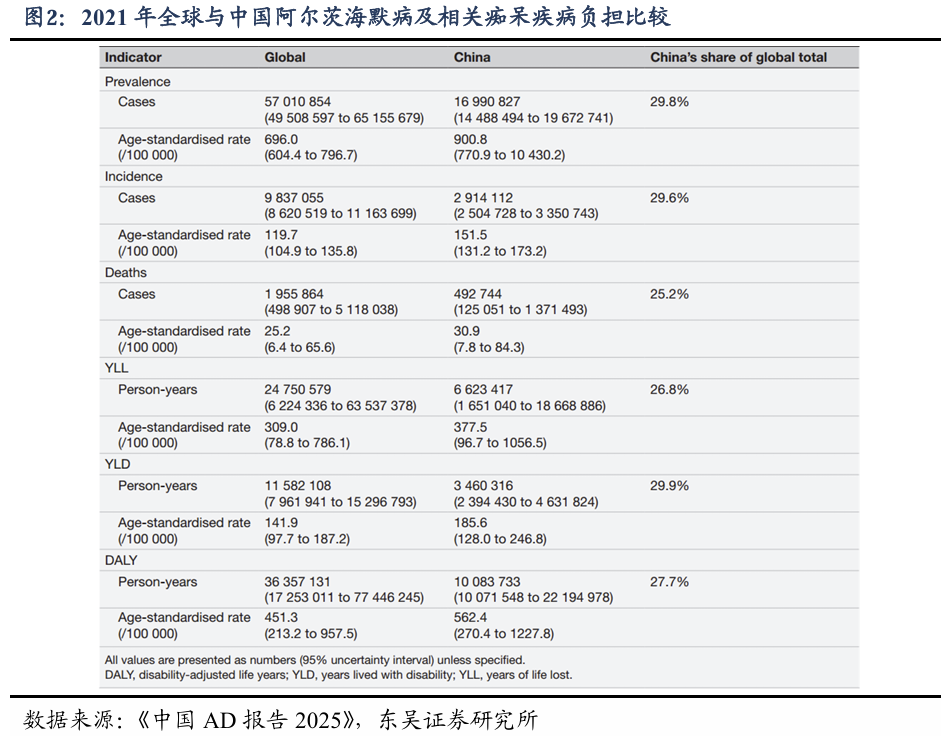 中国是全球AD患者数量最多的国家。根据《中国AD报告2025》,2021年,中国AD及相关痴呆症患者近1700万,占全球总数的29.8%;死亡人数近49万人,占全球总数的25.2%。65岁以上人群患病率随年龄显著上升:65-74岁约5%,75-84岁13%,85岁以上高达33%,女性患病率约为男性的1.8倍。