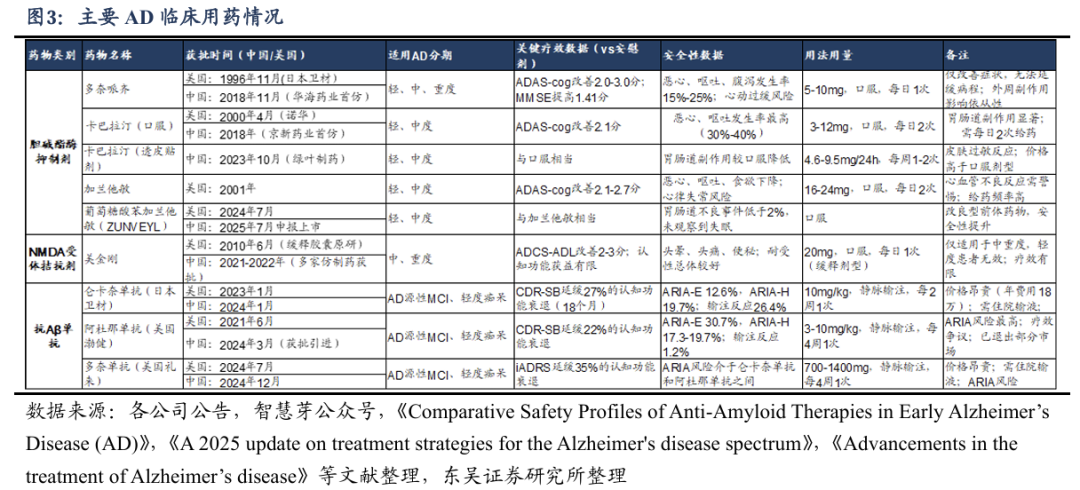 目前,临床常用的AD用药主要包括小分子口服药以及生物制剂,其中,主要包括胆碱酯酶抑制剂(ChEI)如多奈哌齐、卡巴拉汀、加兰他敏,以及NMDA受体拮抗剂美金刚;生物制剂主要包括轮卡奈单抗、多奈单抗等。