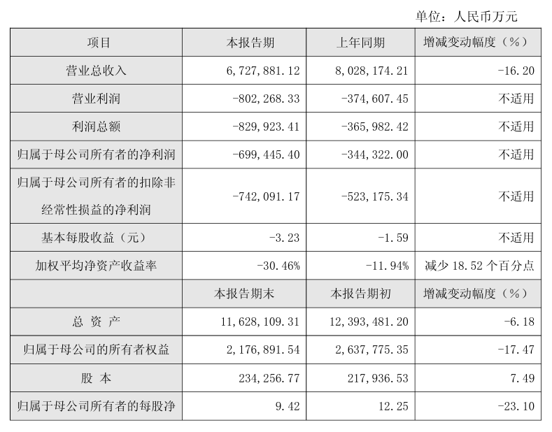 2025年年度,公司全年营业总收入672.79亿元,较上年同期减少16.20%;利润总额-82.99亿元,较上年同期减少;归属于上市公司股东的净利润-69.94亿元,较上年同期减少;归属于上市公司股东的扣除非经常性损益的净利润-74.21亿元,较上年同期减少;基本每股收益-3.23元,较上年同期减少。