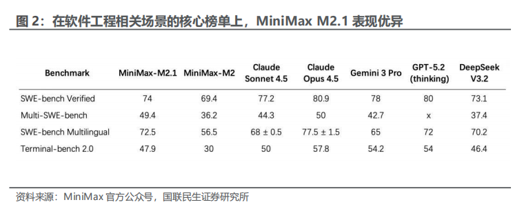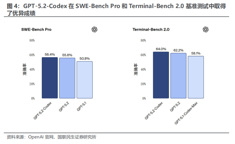 从国外头部大模型看,AI编程也同样成为其发力的重点领域。2025年12月OpenAI发布了GPT‑5.2-Codex,针对Codex 智能体编码进行了深度优化,具体改进包括:通过上下文压缩提升长程任务执行能力、在大规模代码变更(如重构与迁移)中具备更出色的性能。GPT‑5.2-Codex在SWE-Bench Pro和Terminal-Bench 2.0基准测试中取得了优异成绩。