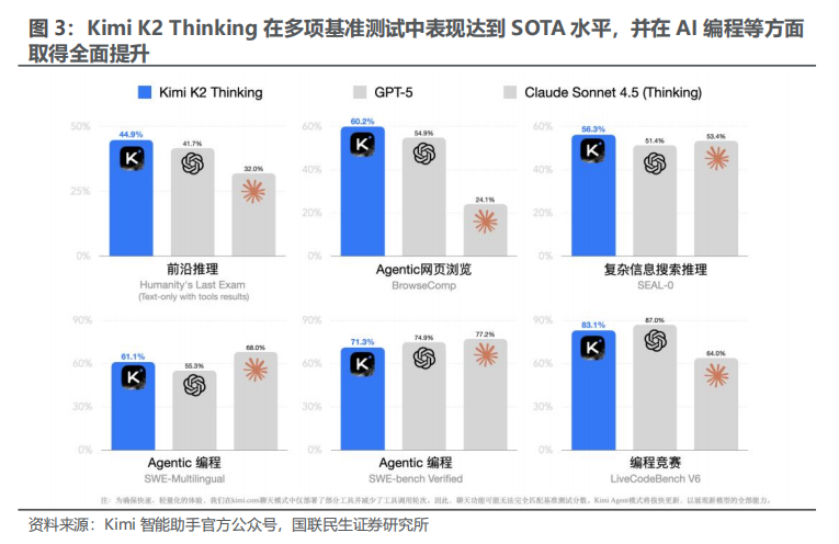 2025年11月Kimi K2 Thinking发布,Agentic 编程能力持续精进。1)编码能力全面增强:Kimi K2 Thinking 模型在多语言软件工程基准 SWE-Multilingual、SWE-bench 验证集和 Terminal 终端使用等基准测试中,表现均有进一步提升。2)前端开发性能提升:在处理 HTML、React 以及组件丰富的前端任务时,性能有明显改善,能够将创意直接转变为功能齐全、响应式的产品。3)Agentic Coding 场景优化:模型能够在调用各种工具的同时进行思考,灵活融入 software agents 中,有效处理更复杂、多步骤的开发工作流。