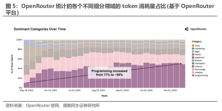 AI编程已经成为国内外头部大模型发力的重点领域,使用端的数据也能够进行佐证。根据OpenRouter发布的《State of AI: An Empirical 100 Trillion Token Study》报告,基于超过100 万亿个真实用户token的消耗数据,分应用领域看,2025年5月以来编程在所有应用领域中的占比持续提升,其占比从11%提升至50%左右。