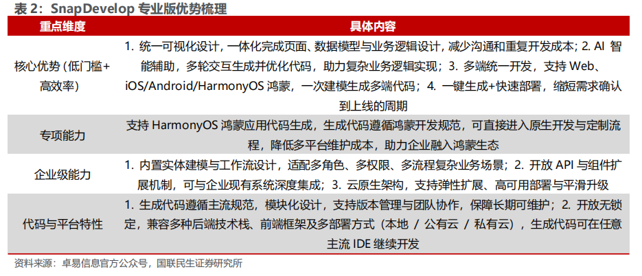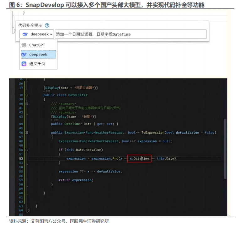 国产头部大模型在AI编程能力上持续提升,有利于国产IDE的发展。国产头部大模型代码生成等能力不断提升,同时以DeepSeek为代表的开源大模型则更有利于提升国产IDE的使用频次和深度。以国产IDE龙头卓易信息的核心产品SnapDevelop为例,其支持DeepSeek、Qwen千问、豆包Doubao等国内头部大模型,每种模型都可以独立配置API Key,并设置为不同的智能体(Agent)来调用,并与自身内置的AI编程助手相配合,实现代码补全、代码解释、自动注释、代码诊断等功能。