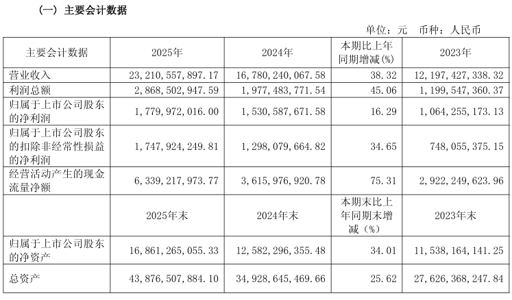 根据公告内容,2025年中远海特实现营业收入232.11亿元,同比增加38.32%;因船队规模和货运量增加导致航次运行费用、船舶折旧费等成本增加等因素影响,营业成本同比增加39.37%至182.80亿元。利润总额28.69亿元,同比增长45.06%;归属于上市公司股东的净利润17.80亿元,同比增长16.29%;归属于上市公司股东的扣除非经常性损益的净利润17.48亿元,同比增长34.65%;经营活动现金流净额63.39亿元,同比增长75.31%。