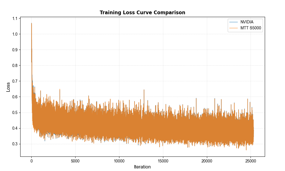 矩阵乘法(GEMM)是大模型训练中的核心算子之一,其数值精度直接影响Loss曲线的收敛表现与最终模型效果。围绕这一关键环节,摩尔线程团队在MTT S5000的架构设计阶段,便针对浮点运算的舍入模式、累加路径等关键计算链路进行了精细化优化。这种来自架构层面的持续打磨,使得MTT S5000在长时间训练过程中保持更稳定的数值表现,为模型训练精度对齐及下游评测效果提升提供了坚实的底层保障。