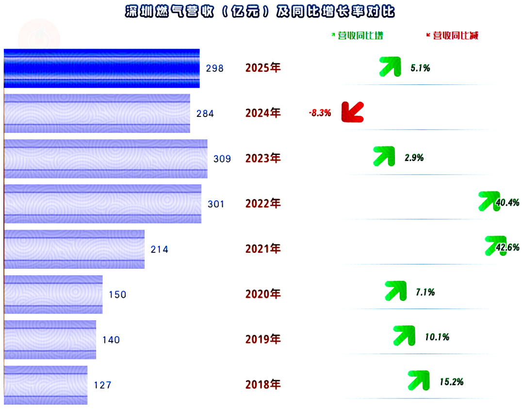 深圳燃气2025年扭转了上年下跌的不利形势,但并没有突破300亿的规模。最近四年就在300亿的左右徘徊,能不能说,这几乎就是深圳燃气发展的阶段性极限水平呢?我认为可能是,或许是阶段性,也有可能是长期的天花板。