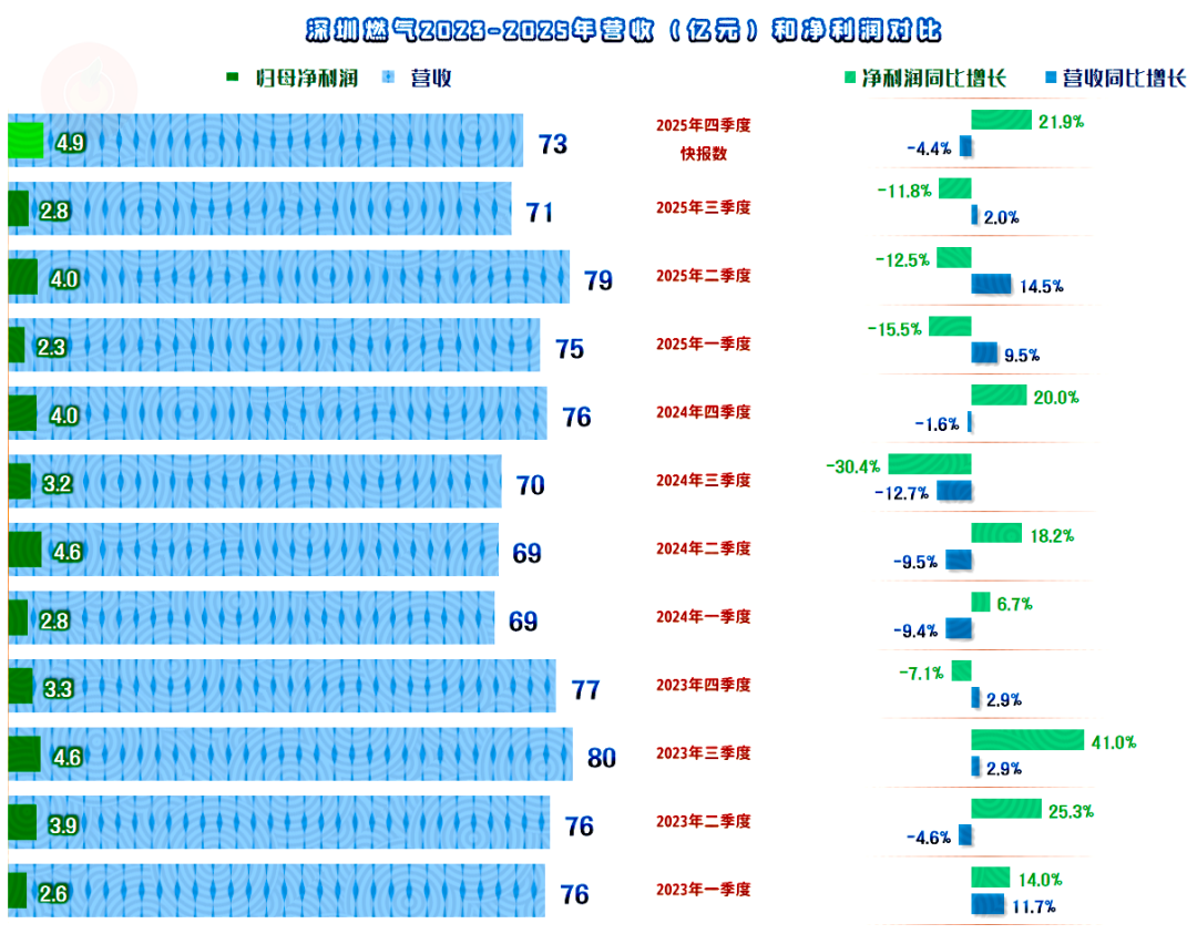 再来看一家发布了《2025年度业绩快报》的上市公司,深圳市燃气集团股份有限公司(股票简称:深圳燃气)成立于1982年,2009年12月在上交所主板上市。深圳燃气是一家以城市燃气经营为主体,燃气资源、综合能源和智慧服务等业务协同发展的市属国有控股上市公司。