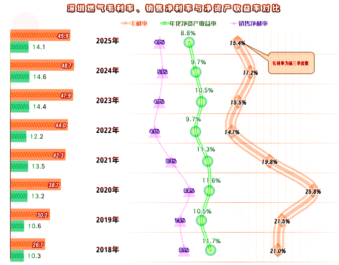2025年前三季度的主营业务盈利空间低于前四年,全年的水平应该会高一些,可能会和2022年及2023年差不多。现在的市场形势,能维持5个百分点的主营业务盈利空间,就已经不错了。期间费用在2024年就开始下降,深圳燃气已经意识到增长可能接近天花板的问题,已经为此做了准备工作,在降低期间费用方面,甚至可以算是小有成效了。