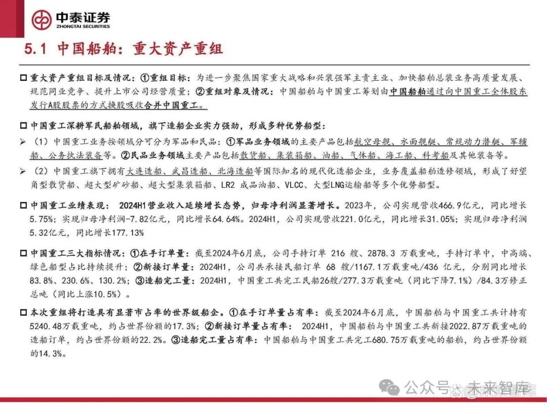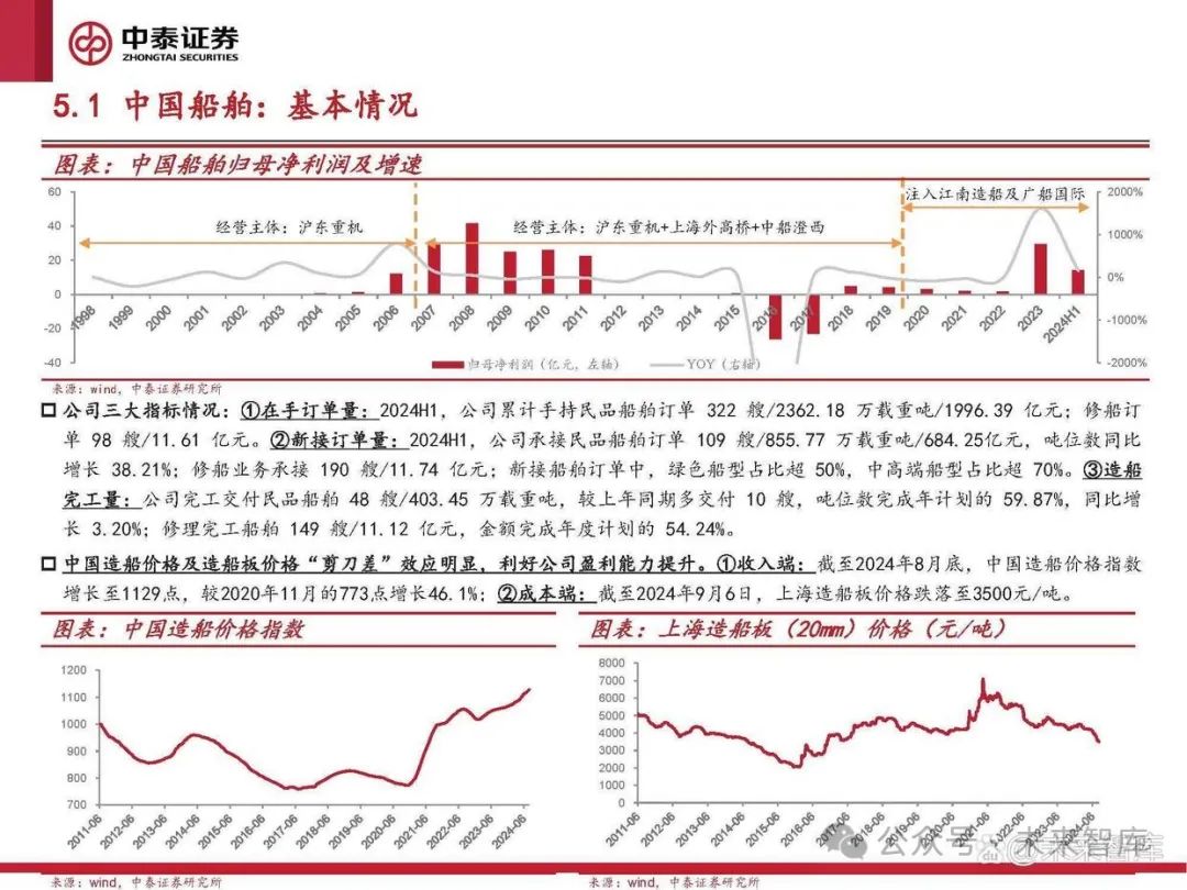 2008年后,全球船舶供给端快速出清。2008年金融危机后,由于订单量大幅度减少以及新船造价持续低迷,全球船厂经历了 多起破产清算和资产重组,产能快速出清,行业集中度急剧提升: ①活跃船厂数持续下滑:根据Clarksons数据,全球活跃船厂数量从2008年峰值的1033家,下降至2024年8月的376家;其中, 中国活跃船厂数量从2008年的464家,下降至2024年8月的161家。 ②行业集中度提升:截至2024年8月,全球Top2造船集团的手持订单量全球占比34%,全球Top5造船集团的订单占比51%,全 球Top10造船集团的订单占比68%。