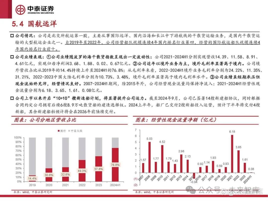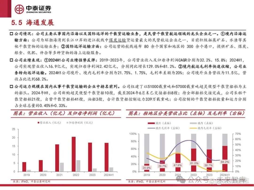 ②海运市场集中度:截至2024年9月,全球前十大集装箱班轮公司市场份额占比达84.5%;干散货及油品运输承运人相对分散, 其市场集中度低于集装箱航运。截至2023年,全球前十大拥有干散货船的航运公司干散货船运力占全球比重约为43%,前十 大拥有油轮船的航运公司油轮船运力占全球比重约为47%。