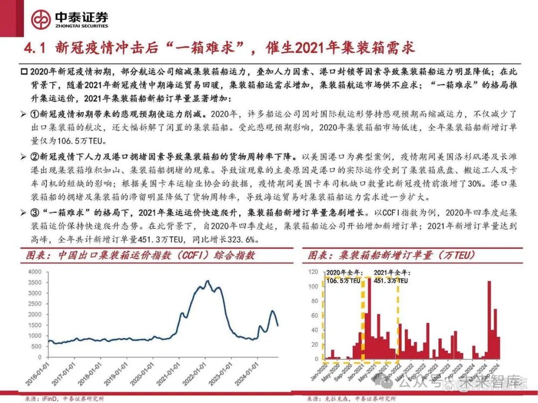 ③“一箱难求”的格局下,2021年集运运价快速爬升,集装箱船新增订单量急剧增长。以CCFI指数为例,2020年四季度起集 装箱运价保持快速爬升态势。在此背景下,自2020年四季度起,集装箱船运公司开始增加新增订单;2021年新增订单量达到 高峰,全年共计新增订单量451.3万TEU,同比增长323.6%。