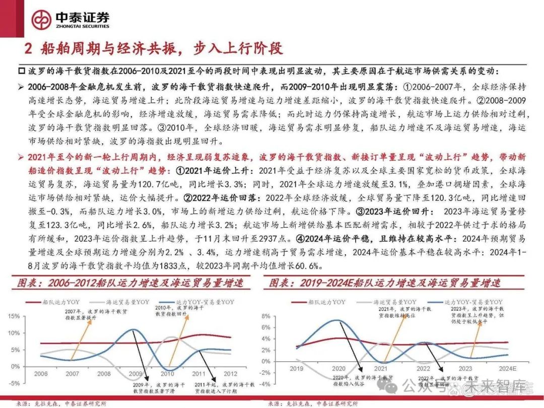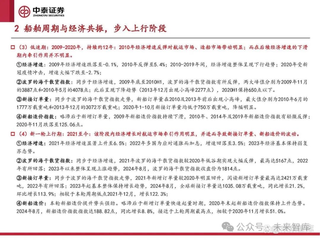 (4)新一轮上行期:2021至今:该阶段内经济增长对航运市场牵引作用明显,并进而导致新接订单量、新船造价的波动。 ①经济增速:2021年经济增速显著上升至6.5%;2022年多国为应对通胀而加息,增速回落至3.5%;2023年经济基本保持弱复 苏态势。 ②波罗的海干散货指数:同步于经济增速,2021年波罗的海干散货指数较2020年低谷期实现大幅反弹,最高达5167点,2022 年有所回落;2023年以来整体呈现上涨趋势,2024年8月,波罗的海干散货指数收盘价为1814点。 ③新接订单量:同步于波罗的海干散货指数走势,2021年新增订单量较2020年明显回升,阅读新增订单量最高达2421万载重 吨,2022年有所回落;2023年起基本整体保持增长趋势,2024年8月,全球新接订单量达1035.08万载重吨,同比增长21.2%, 环比增长113.9%;相较于本轮周期低点2021年12月,增长122.3%; ④新船造价:本轮新船造价提升势头强劲。略滞后于新增订单量快速起量时期,2020年末起新船造价指数保持上升态势。 2024年8月,新船造价指数指数达188.82点,同比增长8.8%,接近于上轮周期最高点,相较于2020年11月增长51.0%。