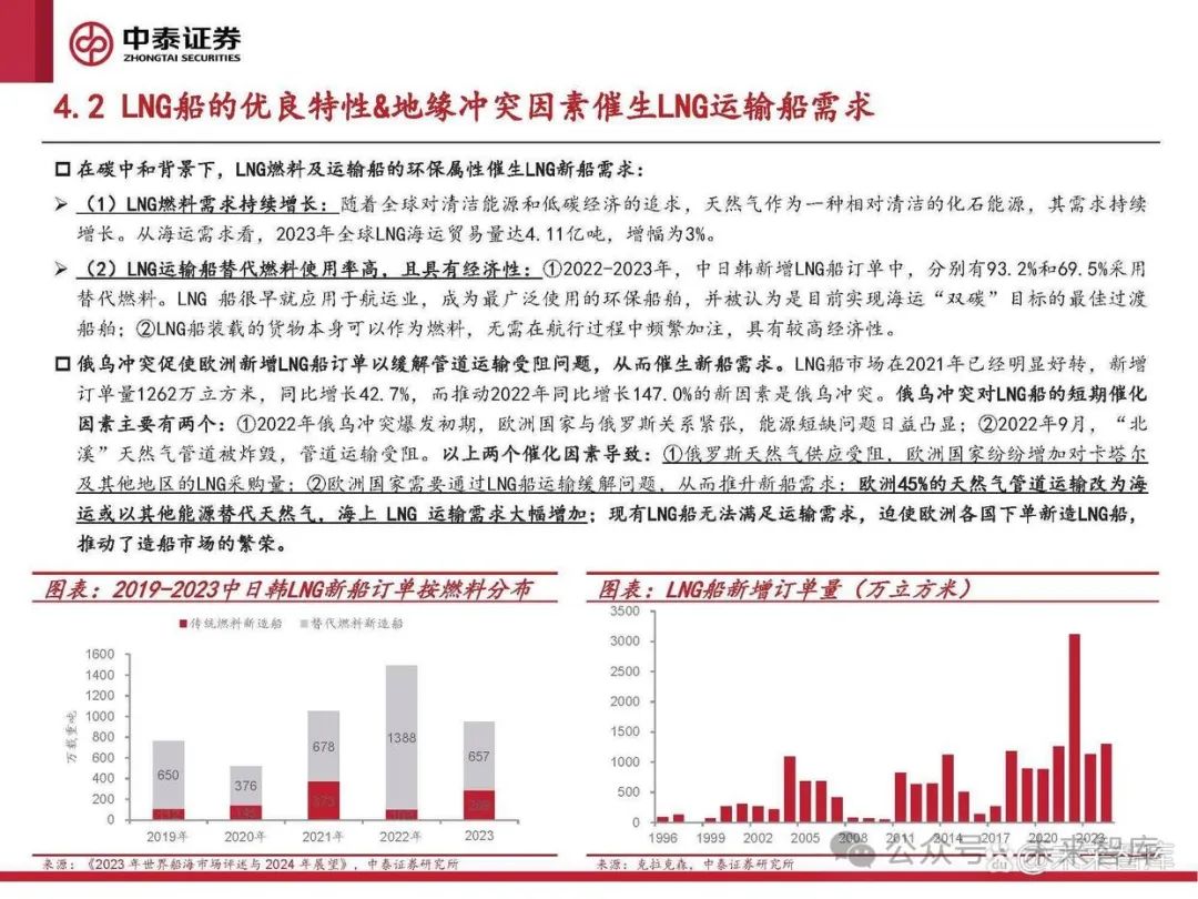 (4)液化气船是专门运输液化天然气(LNG)、液化石油气(LPG)、乙烯等液化气体的船舶;其中,LNG运输船因极高的建 造难度被誉为“皇冠上的明珠”,具有高技术性、高可靠性、高附加值等特点。液仓是LNG船的核心装备,可按液仓种类将 LNG船分为薄膜型和自撑型(球罐型、棱柱型);由于薄膜型技术复杂、造价高,因此多用于大型而非中小型LNG船。