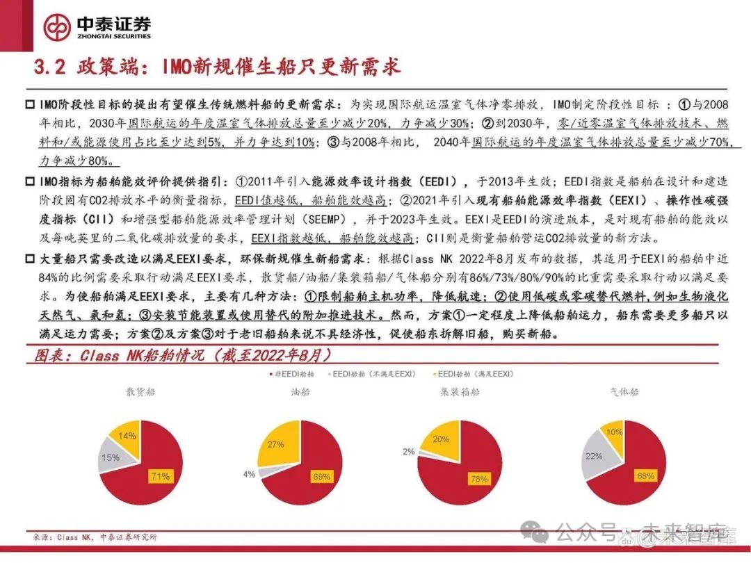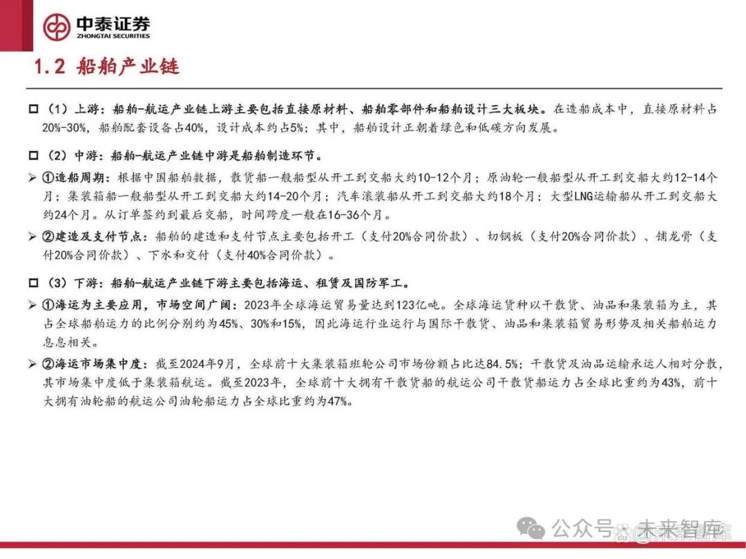 (1)上游:船舶-航运产业链上游主要包括直接原材料、船舶零部件和船舶设计三大板块。在造船成本中,直接原材料占 20%-30%,船舶配套设备占40%,设计成本约占5%;其中,船舶设计正朝着绿色和低碳方向发展。