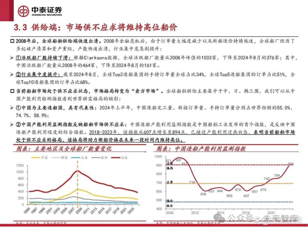 当前船舶市场处于供不应求状态,市场格局转变为“卖方市场”。全球船舶供给主要集中于中、日、韩三国,我们可以从中 国产能利用检测指数看到世界供需格局的缩影: ①中国为主要造船国,具有代表性:2024年上半年,中国造船完工量、新接订单量、手持订单量分别占世界份额的55.0%、 74.7%、58.9%; ②中国产能利用监测指数反映船舶市场供不应求:中国造船产能利用监测指数是中国船舶工业发布的首个指数,是反映中国 造船产能利用程度的综合指数。2018-2023年,该指数从607点增长至894点,已接近产能利用过热状态,表明当前船舶市场 处于供不应求的格局,该格局将助力新船价格在未来一段时间内维持高位。