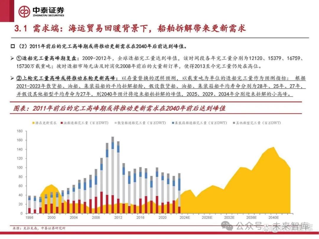 在海运贸易回暖背景下,船舶“老龄化”现象催生中短期更新需求;2010年前后的完工高峰或将推动更新需求在中长期内 爬升至高点: