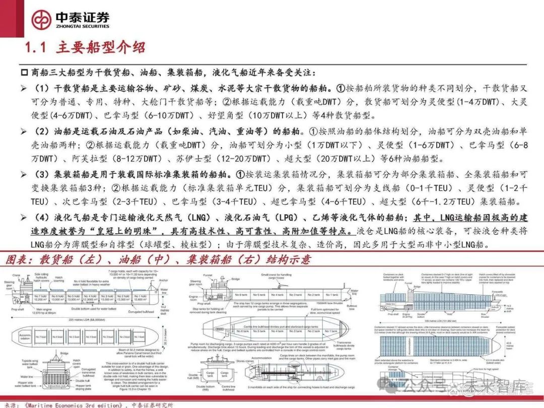 商船三大船型为干散货船、油船、集装箱船,液化气船近年来备受关注: