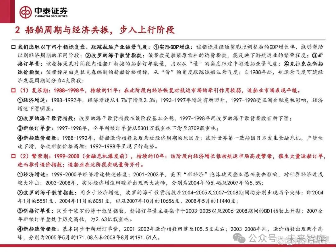 我们选取以下四个指标复盘、跟踪航运产业链景气度:①实际GDP增速:该指标是经通货膨胀调整后的GDP增长率,能够帮助 识别经济周期的不同阶段;②波罗的海干散货指数:该指数是散装原物料的运费指数,能反映下游航运业的繁荣程度;③新 接订单量:该指标是某时间段内造船厂新接的船舶订单数量,用以从“量”的角度跟踪中游造船业景气度;④克拉克森新船 造价指数:该指标是由克拉克森编制的新船价格指标,从“价”的角度跟踪造船业景气度;自1988年起,航运景气度可随经 济发展周期划分为4大阶段: