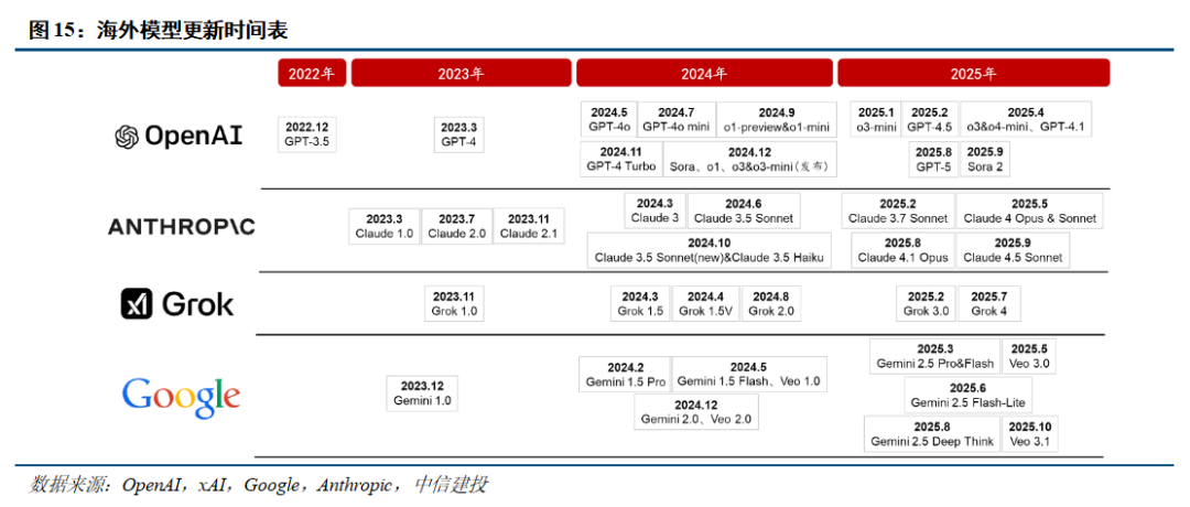 2024年以来,国内外模型均加速迭代。其中海外各家大厂模型能力侧重有所不同,OpenAI通过GPT-5统一了O系列和数字系列模型,并聚焦幻觉率下降以适配用户落地需求;Anthropic的Claude围绕编程能力不断优化,Sonnet 4已支持百万token上下文;xAI基于20万GPU集群开发的Grok 4引入了多个智能体共同思考的模式,其RL投入的算力已超过Pre-Training算力;Google Gemini和Veo模型则分别对应Chrome和YouTube产品生态。国内由阿里主导开源生态,围绕“全尺寸”“全模态”“多场景”推出各种模型;初创厂商中DeepSeek及MiniMax亦入局争夺开源第一宝座,DeepSeek-R1、MiniMax-M2模型均以较低成本实现较高性能。