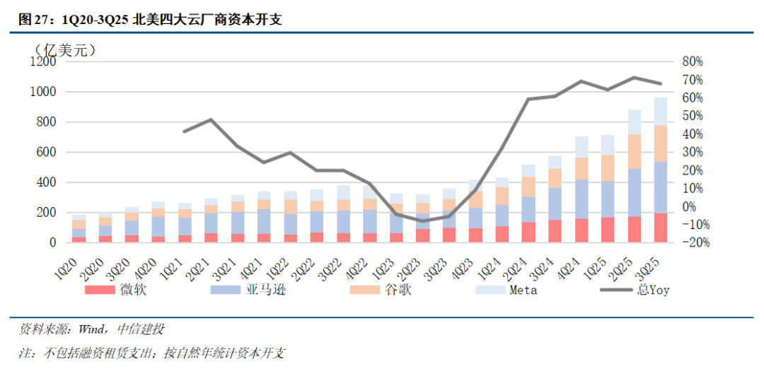 本轮全球算力基础设施建设提速主要源自国内外大型科技企业持续的资本开支增加。自2022年以来,北美四大云厂商为代表的国内外大型科技企业资本开支经历了显著的周期性变化。2022年至2023年上半年,受宏观经济逆风及疫情后需求变化影响,资本开支增速放缓甚至出现负增长。然而,自2023年下半年起,受生成式AI技术突破驱动,无论是海外的科技巨头,还是国内的互联网大厂,均在人工智能基础设施上投入重金,开启了新一轮激进的“AI军备竞赛”,资本开支在2024年和2025年呈现爆发式增长,主要资金流向AI基础设施,主要包括购买GPU和定制芯片、建设或租赁大规模智算中心、采购配套能源设施等,以应对大模型训练与推理带来的算力挑战。2025年全球各大云厂商均宣布了近千亿美元级别的资本开支计划,核心投向用于AI训练和推理的GPU集群,其中OpenAI正计划到2030年累计投入约6000亿美元用于算力支出,字节跳动初步规划2026年资本开支1600亿元人民币,较2025年同比增长7%,阿里云则在未来三年3800亿元资本开支基础上额外增加投入。