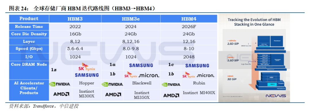 HBM迭代周期随之显著缩短。2025年下半年,英伟达量产的GB300搭载的是12层24GB的HBM3e,2026年英伟达将发布的Rubin系列和AMD将发布的MI400系列均将搭载HBM4/4e。其中英伟达计划在26Q1完成HBM4的最终资格测试。从更新周期来看,JEDEC于2025年4月正式发布了JESD 270-4高带宽存储器(HBM4)标准,(接口宽度从HBM3/HBM3e的1024位翻倍至2048位;堆栈通道数从16个增加到32个,支持24Gb或32Gb芯片的4到16层堆栈配置),较HBM3规范发布约三年,计划落地时间较HBM3落地时点亦在三年左右。根据EETimes的预测,HBM的迭代周期从前期的每四年一代提高并稳定到每两年到两年半一代。