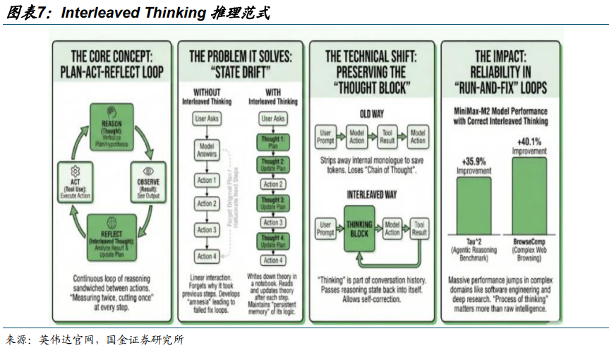 推理方面,MiniMax M2、DeepSeek V3.2 等国产大模型,把“思考 → 行动 → 观察 → 再思考”的动态循环模式(Interleaved Thinking)融入推理流程,正成为 Agent 模型标配。我们认为,国内 Interleaved Thinking 范式渗透,能够显著提高 Agent 的准确性和规划能力,2026 年Token 消耗与推理需求有望加速爆发。