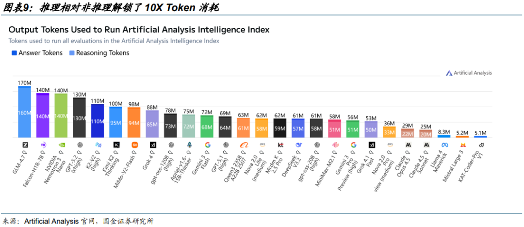 推理相对非推理解锁了 10X Token 消耗。随着大模型参数边际效应的初现,技术竞争的关键变量开始向后训练发生结构性转移。Post-training 将训练从通用的参数堆叠转向了基于高质量私有数据的监督微调与人类反馈强化学习,训练过程需要引入海量由高算力生成的合成数据进行反复迭代。在这一阶段,模型在响应用户指令之前,会先在内部生成长思维链,自主进行策略试错、逻辑推演与自我纠错,从而显著提升了解决复杂数学与逻辑问题的准确率。据 AA,推理模型相对非推理模型在 Token 消耗量上出现 10X 提升。