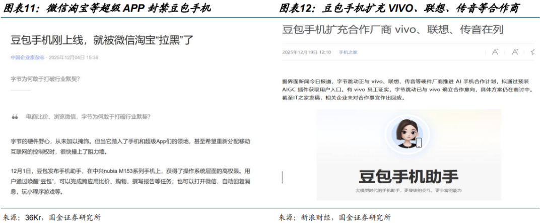 量分发层推到了系统权限层,已成必争之地。豆包绕开传统接口,用“看屏幕 代操作”的方式在现有生态之上再搭一层“AI 操作系统”,AIOS 直接触碰微信、支付宝等超级 App 的商业命门,传统 App 时代的游戏规则面临挑战,微信、淘宝等超级 App 陆续封禁豆包手机权限。但值得注意的是,华为、小米、荣耀、OPPO、vivo 等品牌均在旗舰机型里注入 AI Agent 能力,模型厂商仍有望通过开源或广泛结盟来绕过 APP 厂商的封锁。
