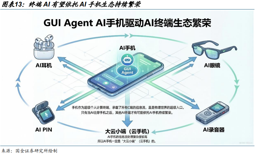 GUI Agent AI手机的出现有望驱动形成繁荣的AI终端生态。因为手机作为超级个人计算终端,承载了几乎所有 C 端的信息流,且是物理世界的超级入口,所以只有当 AI 击穿手机之后,其他 AI 终端才有可能依托 AI 手机持续繁荣,并且由于 AI 手机的信息流处理复杂度较高,所以AI 手机一定是“大云小端” 的,进一步拉动算力需求。
