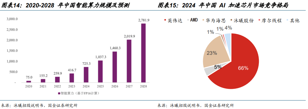 智算中心持续扩容,国产替代加速。根据 IDC 数据,2020 年中国智能算力规模为 75.0 EFLOPS,到 2028 年预计将达到 2,781.9 EFLOPS,预计 2020-2028 年复合增长率达到57.1%。随着地缘政治紧张局势推动中国企业寻求本地替代方案,以及国产芯片技术的稳步提升,国内云服务提供商正在加速构建异构环境(将不同类型的芯片结合使用,如 CPU、GPU、国内替代芯片)。例如,腾讯云已将其异构计算平台全面兼容所有主流国产芯片,以满足内部开发和客户对 AI 算力的需求 。根据 Bernstein Research,2024 年中国 AI 加速芯片市场中,英伟达、AMD 市场份额分别为 66%、5%,合计占比达 71%。但受益于国产替代趋势及供应链安全需求,国内计算芯片公司正迅速提升。其中,华为海思/沐曦/摩尔市场份额已分别达到23%/1%/1%。