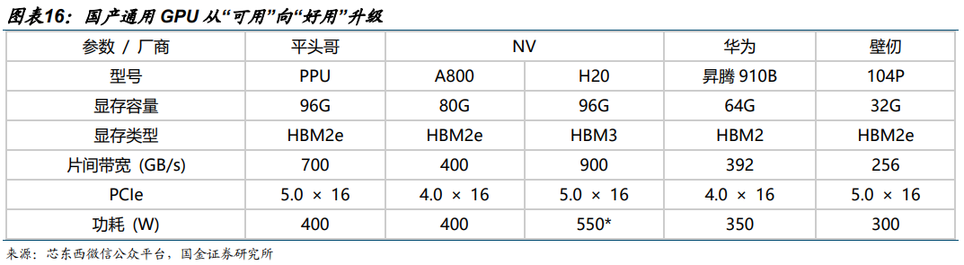 国产通用 GPU 从“可用”向“好用”升级。国产 GPU 在性能指标、软件生态、应用适配等方面与 NV 最先进一代仍有差距,但已基本追平 H20、A100 等,且在本地化服务、政策支持、成本控制等方面具备优势。随着资本持续注入,国产企业有望在细分场景实现突破,逐步扩大市场份额。1)算力指标上:国内多数头部企业主流在售产品的 FP16/BF16 在 100-300 TFLOPS 左右,处于英伟达 A100 产品阶段,少数厂商通过先进封装等方式实现接近英伟达H100 产品的算力,为国内最先进水平;2)显存方面:国内企业结合自身产品特点,分别选择 HBM2e、HBM2、GDDR 等显存类型,显存带宽在 0.5-2 TB/s 左右。
