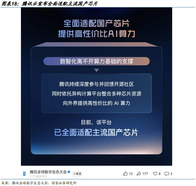 CSP 厂商加速适配,助力国产芯片生态建设。英特尔的 X86 生态、英伟达的 CUDA 生态之所以难以撼动,核心在于形成了“芯片 -软件-应用”的闭环。而当前国产阵营中,华为昇腾、阿里平头哥、壁仞科技等芯片厂商各有技术路线,生态分散问题显著。腾讯集团高级执行副总裁汤道生在交流中坦言,不同参数规模的 AI 模型需要适配不同芯片配置,当前只能通过与多家厂商合作实现场景覆盖。百度、阿里等企业加速适配国产芯片,推动“芯片-模型-应用”闭环形成。